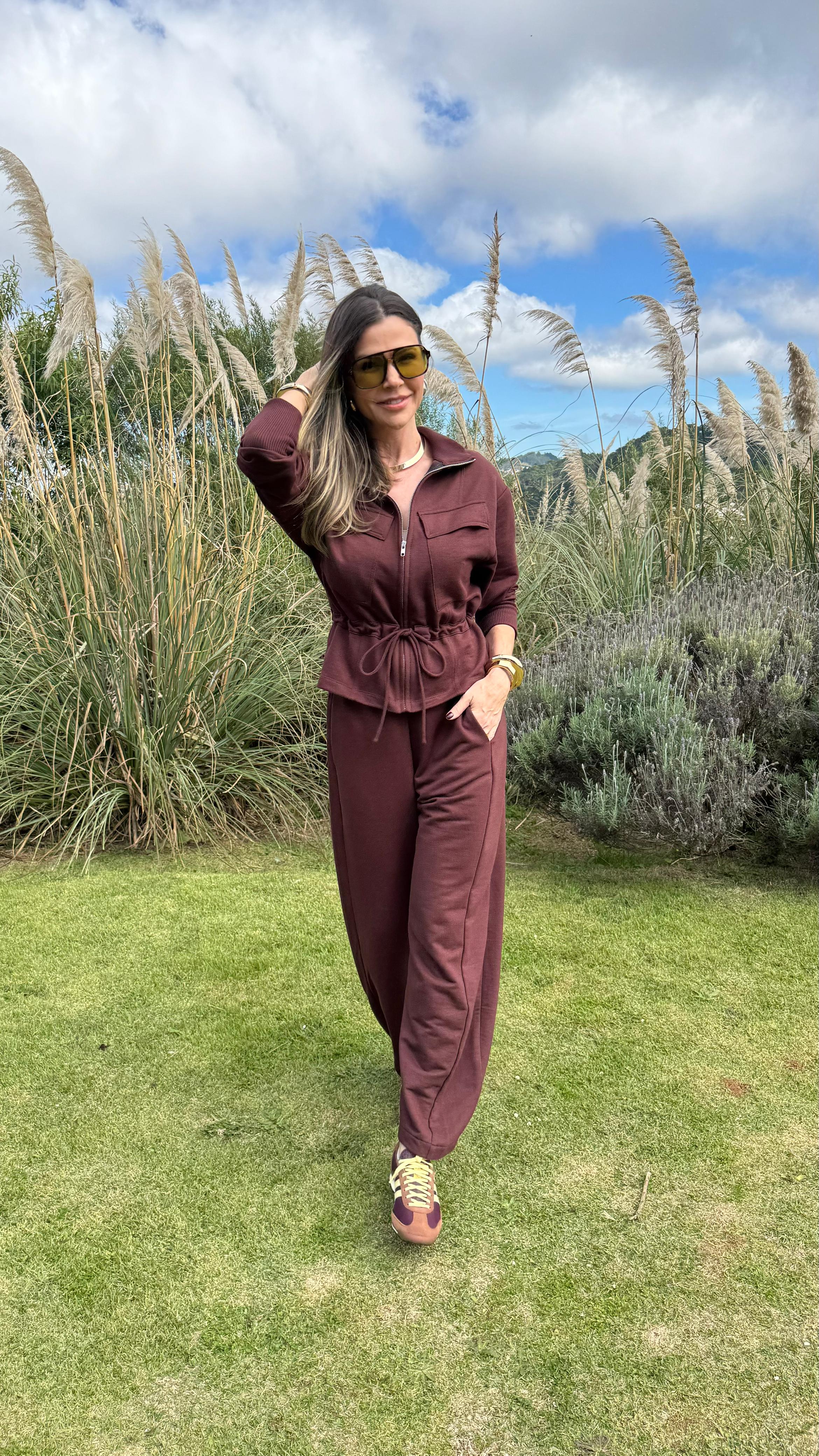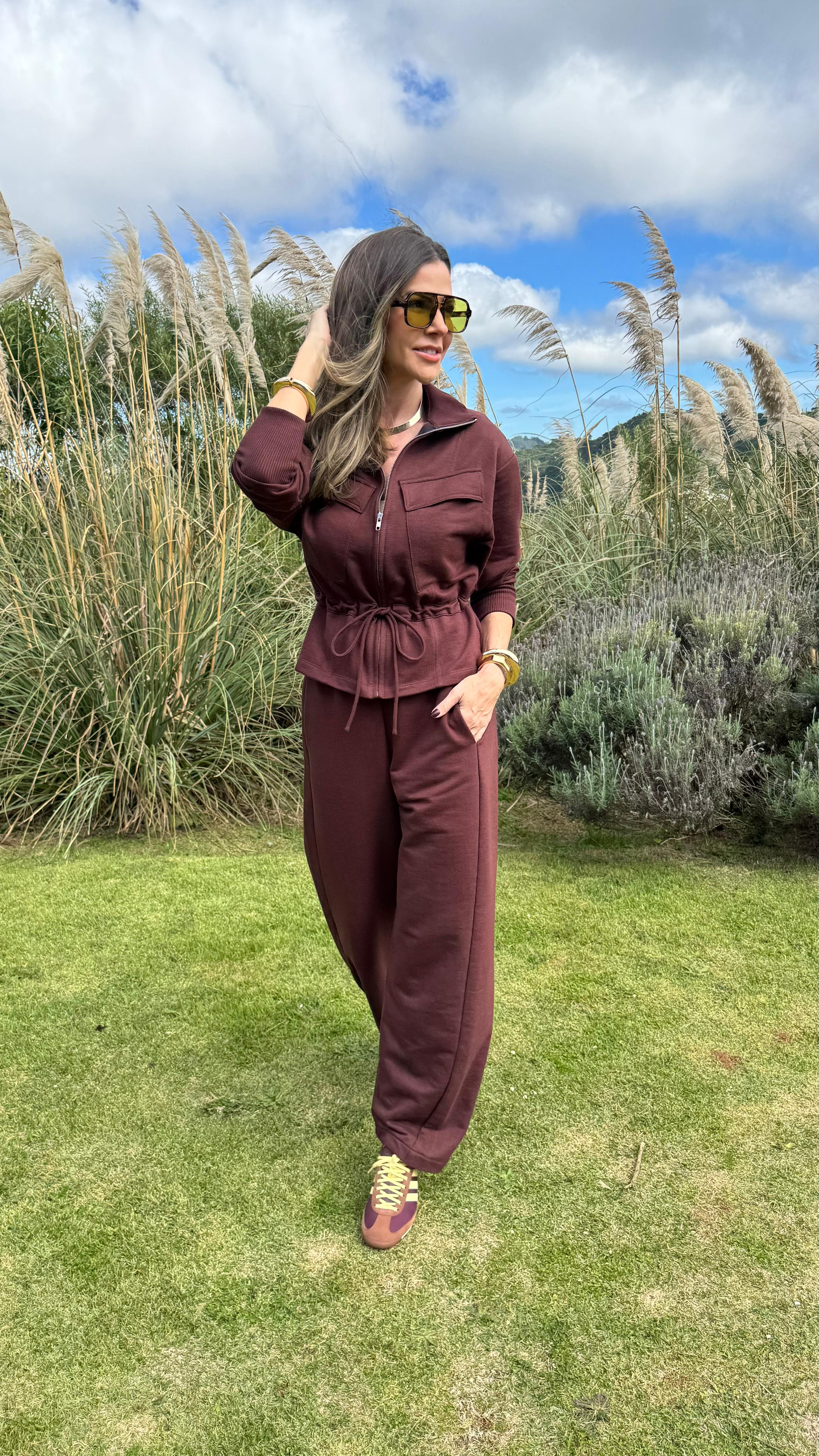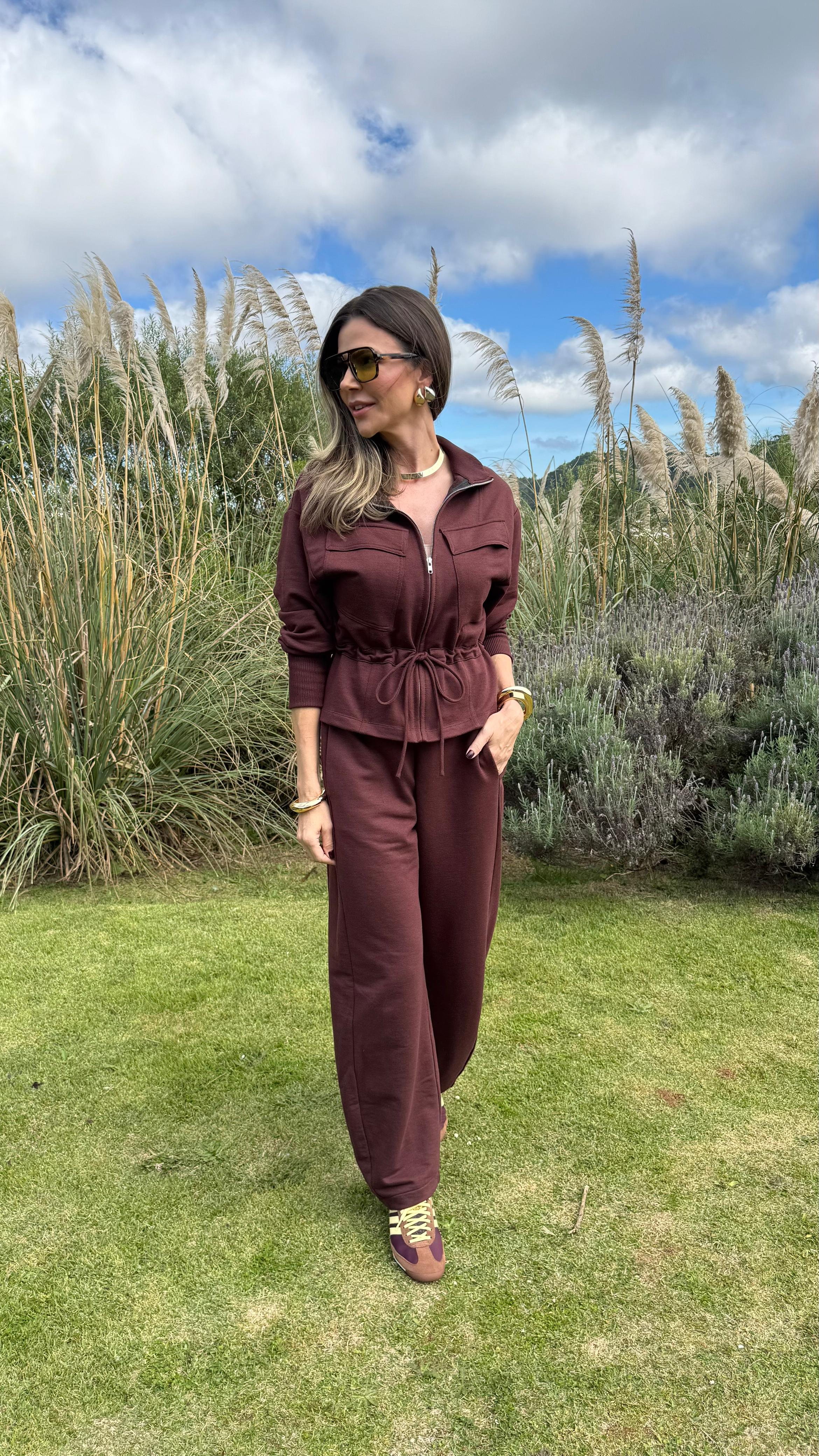 Conjunto en color chocolate confeccionado en suave tejido de moletón, ideal para looks cómodos y estilosos. La chaqueta presenta un diseño moderno, cierre frontal y bolsillos funcionales, además de puños acanalados para un mejor ajuste. La calza, con cintura elástica y cordón regulable, ofrece un calce relajado y práctico para el día a día.