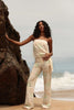 Top strapless confeccionado en lino con viscosa con exclusivo estampado, asimetr’a en la parte baja. Pantalón largo de modelaje recto con bolsillos laterales, cierre de cremallera lateral y botón interno.
