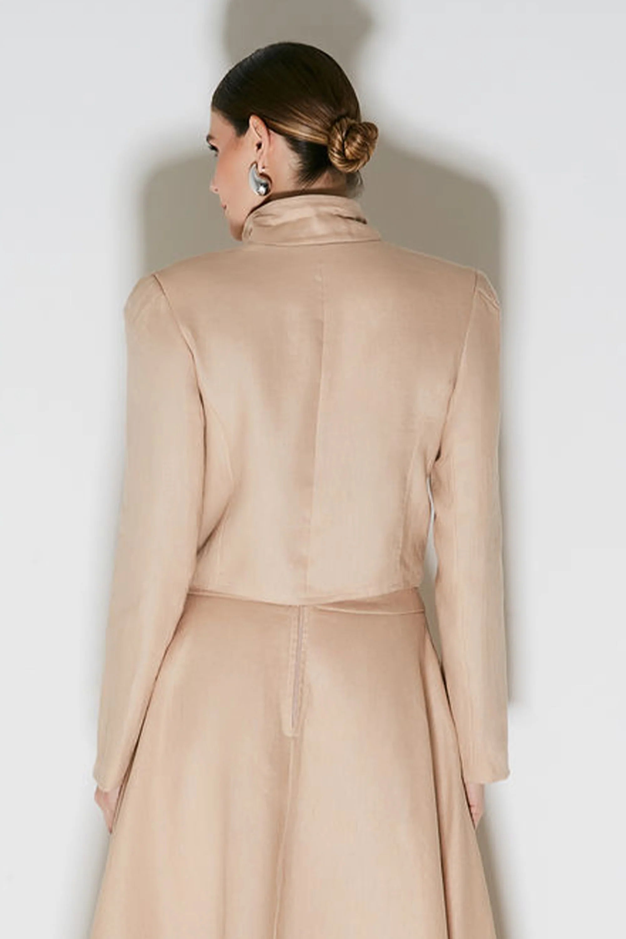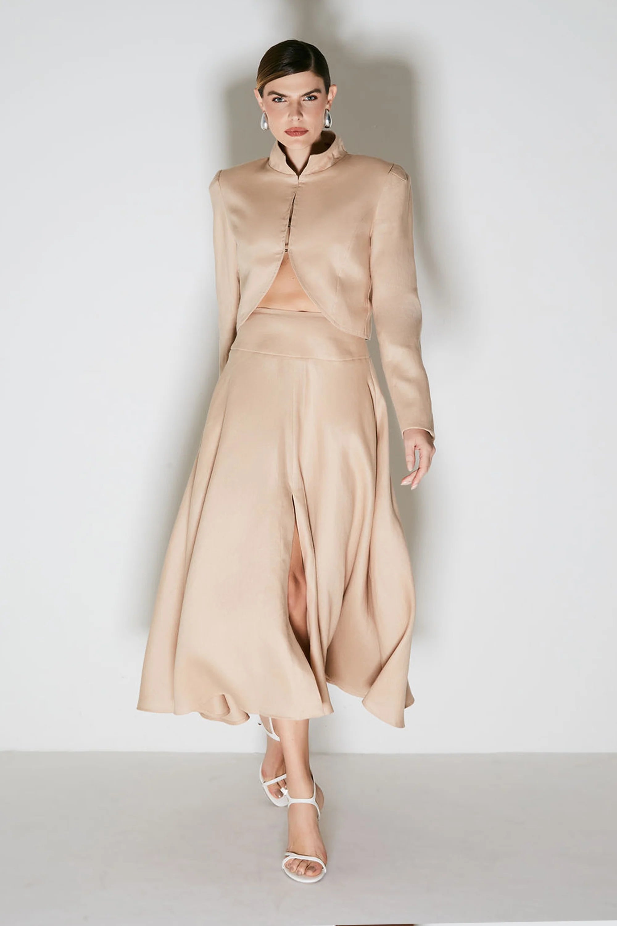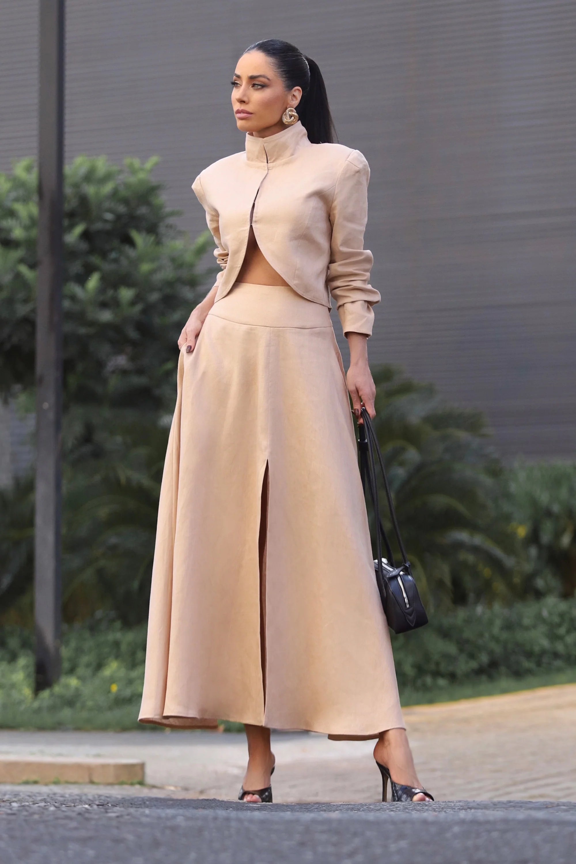 Falda confeccionada en lino en color caqui claro. La prenda presenta un largo midi, caída fluida, abertura en la parte delantera, cinturilla ancha y bolsillos a la altura de la cadera. Cierre mediante cremallera.