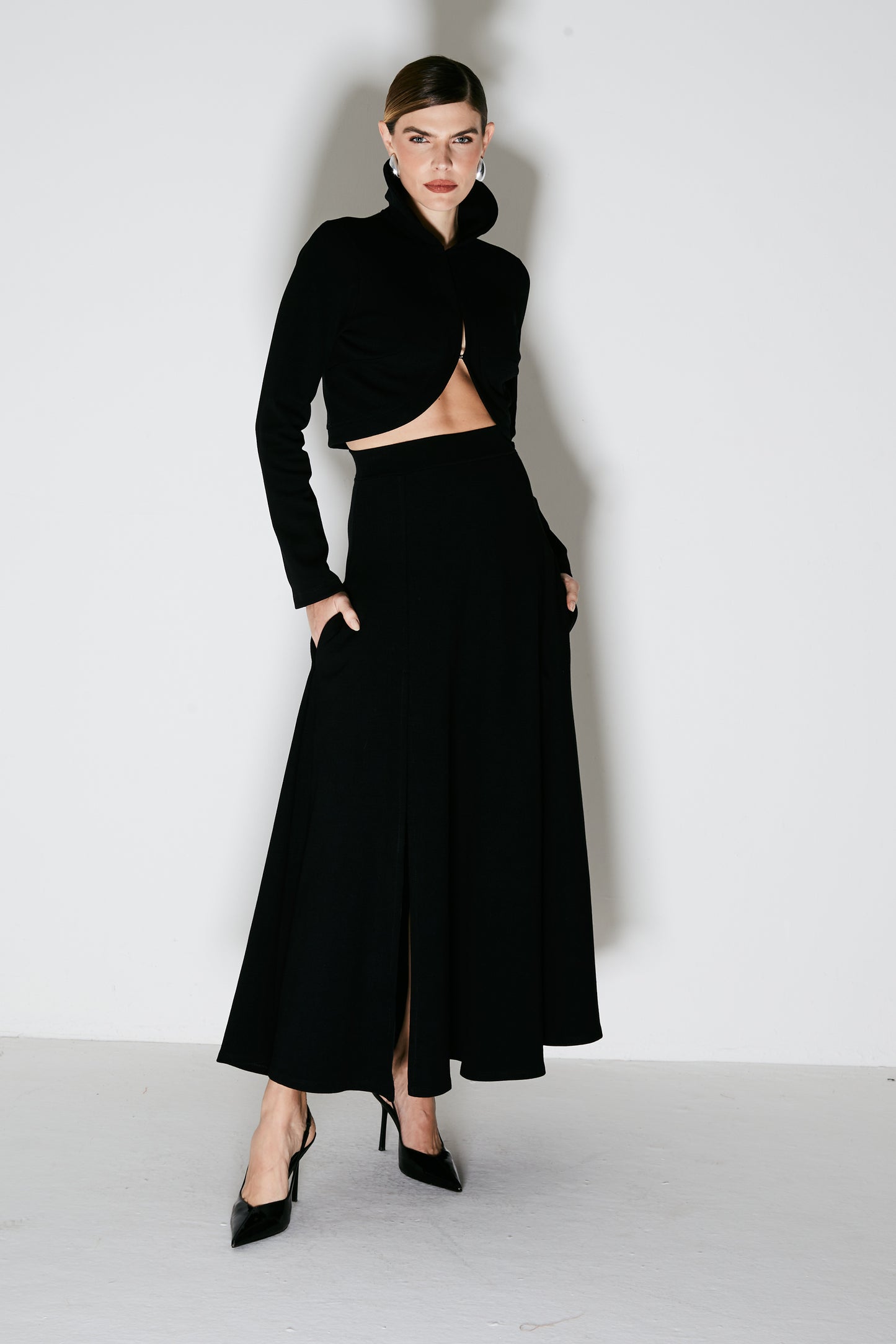 Falda confeccionada en punto de viscosa en color negro exclusivo de la marca. La prenda tiene un largo midi, caída fluida, dobladillo amplio con abertura lateral y bolsillos a la altura de la cadera. Cierre con cremallera.